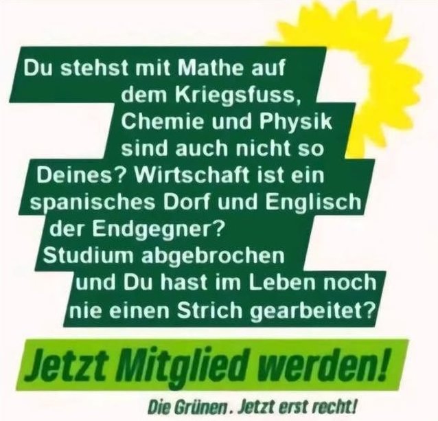 Heute werde ich meinen Enkeln sagen: Wenn ihr in der Schule nicht aufpasst und nichts lernt, dann ist das nicht so schlimm. Dann könnt ihr immer noch zu den Grünen gehen.