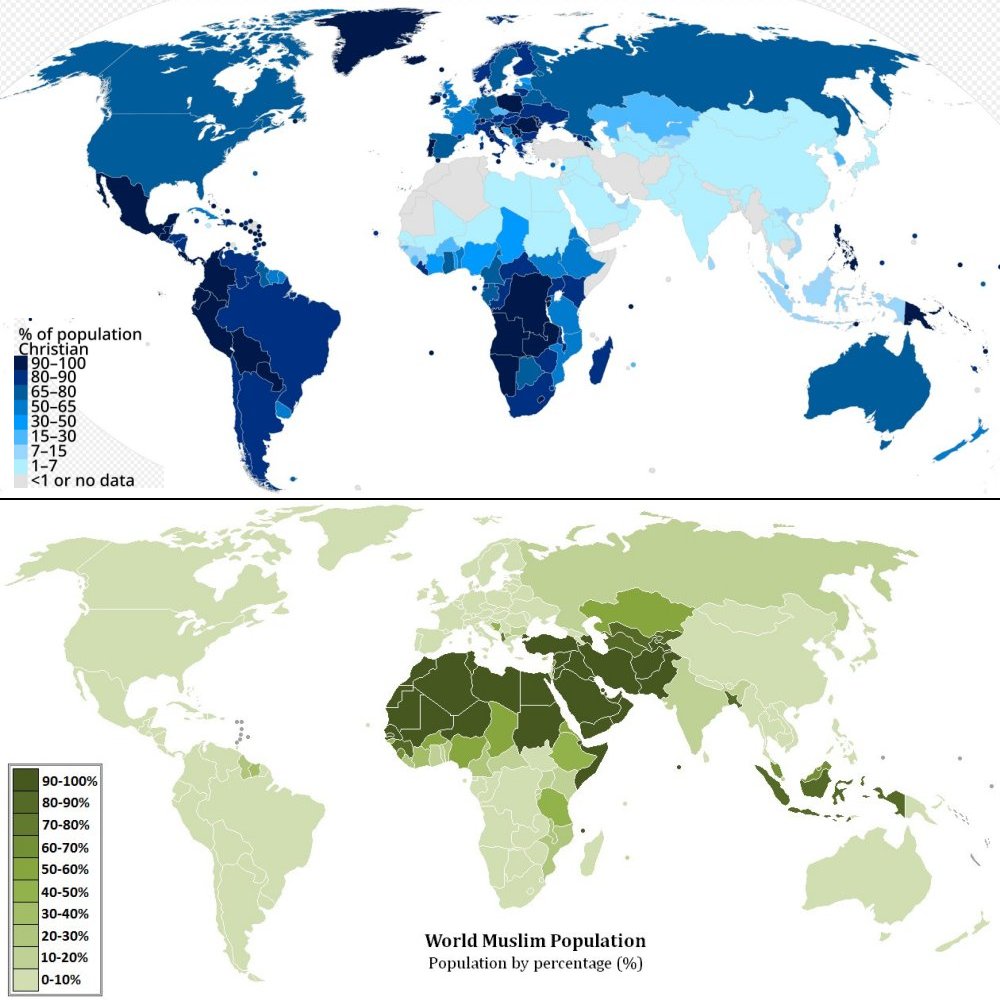 Die beiden Bilder zeigen ihnen den prozentualen Anteil der Christen und Muslime in den Staaten der Welt (blau Christen, grün Muslime). Hinweisen möchte ich sie besonders auf die Situation in Nordafrika und Vorderasien.