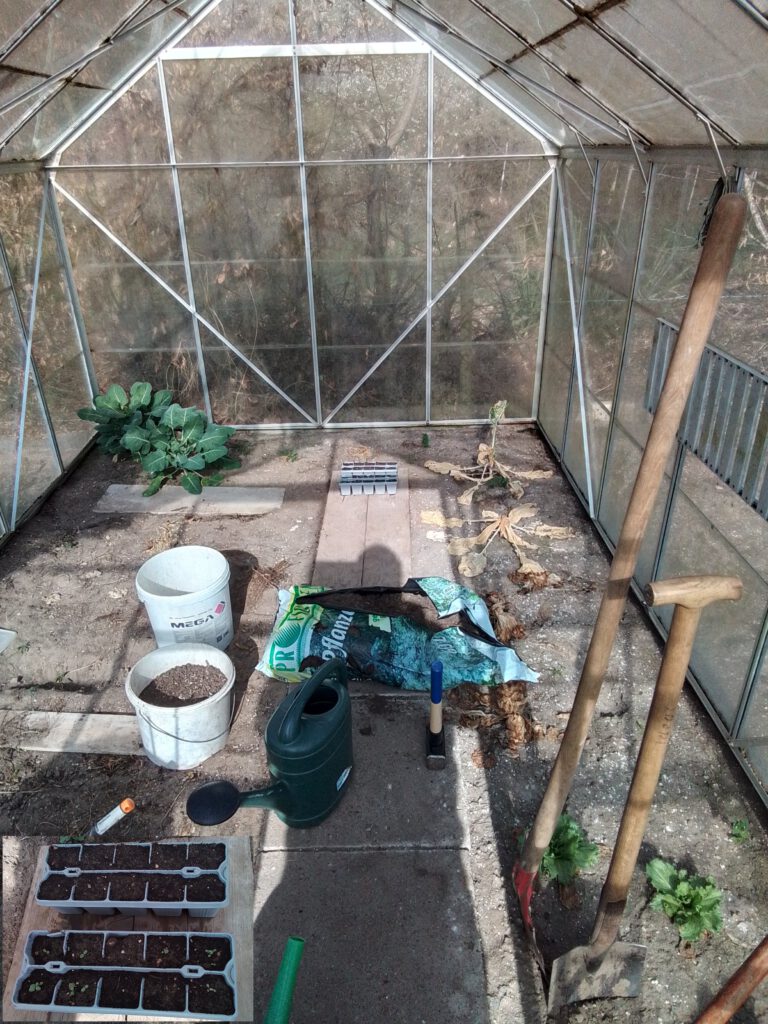 Und dann habe ich ja noch ein Gewächshaus. Das sieht momentan noch ziemlich wüst aus, muss also auch noch hergerichtet werden